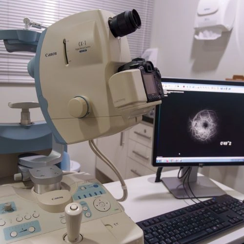 Fotografia do fundo do olho que permite avaliar a retina, vasos sanguíneos e nervo óptico, sendo muito utilizada no acompanhamento de doenças como diabetes e outras doenças retinianas.