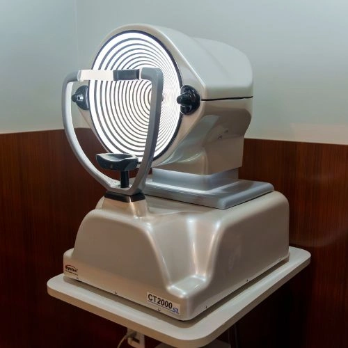 Exame que mapeia a curvatura da córnea, auxiliando no diagnóstico de ceratocone, irregularidades corneanas e na avaliação para cirurgias refrativas.